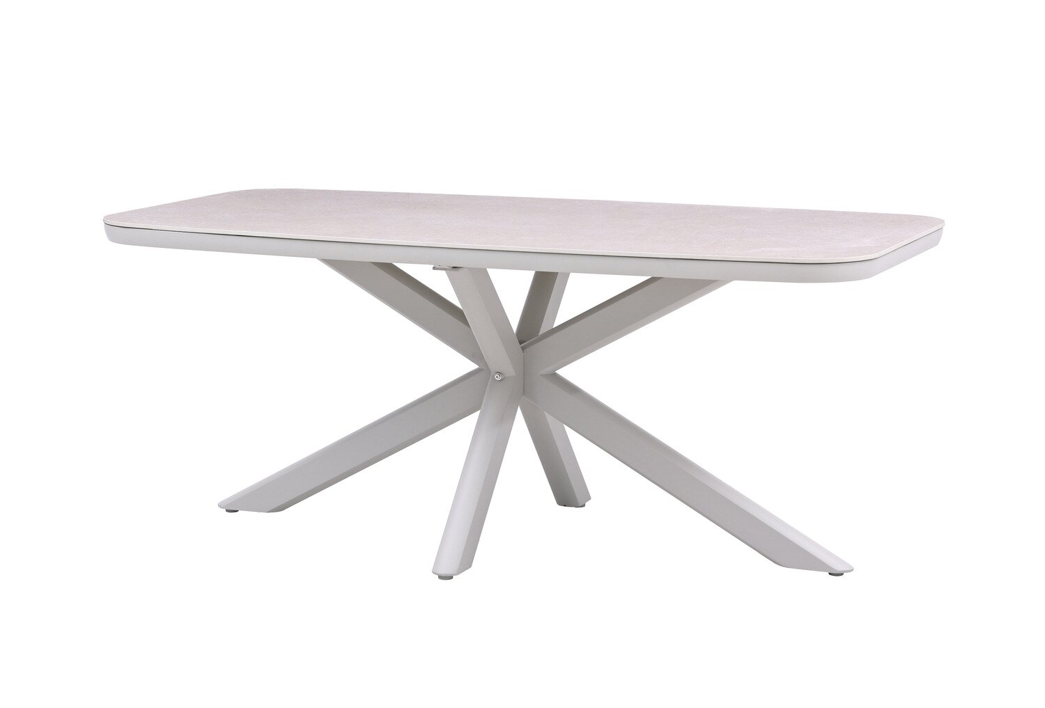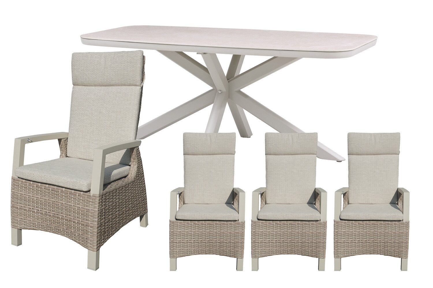 Binnen deze opstelling is de Jura dining tafel het centrale punt voor diners en gezellige buitenmomenten. Met een zandkleurig aluminium frame en een sintered stone tafelblad in naturel krijgt dit onderdeel een uitstraling die goed past bij intensief gebruik in tuin of op terras. Daarnaast heeft het meubel afmetingen van L 180 x B 90 x H 74 cm.