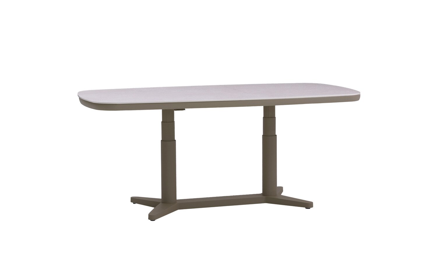 Met een afmeting van L 180 x B 90 cm biedt de tafel ruimte voor vier tot zes personen. De verstelbare hoogte van H 53/75 cm maakt het mogelijk om de tafel te gebruiken als lounge- of eettafel, afhankelijk van jouw behoefte. Het aluminium frame garandeert stabiliteit en duurzaamheid, terwijl het sintered stone blad bestand is tegen krassen, hitte en weersinvloeden.