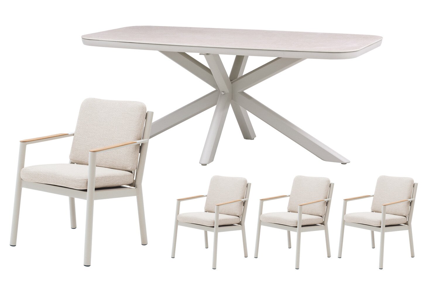 Binnen deze opstelling is de Jura dining tafel het centrale punt voor diners en gezellige buitenmomenten. Met een zandkleurig aluminium frame en een sintered stone tafelblad in naturel krijgt dit onderdeel een uitstraling die goed past bij intensief gebruik in tuin of op terras. Daarnaast heeft het meubel afmetingen van L 180 x B 90 x H 74 cm.