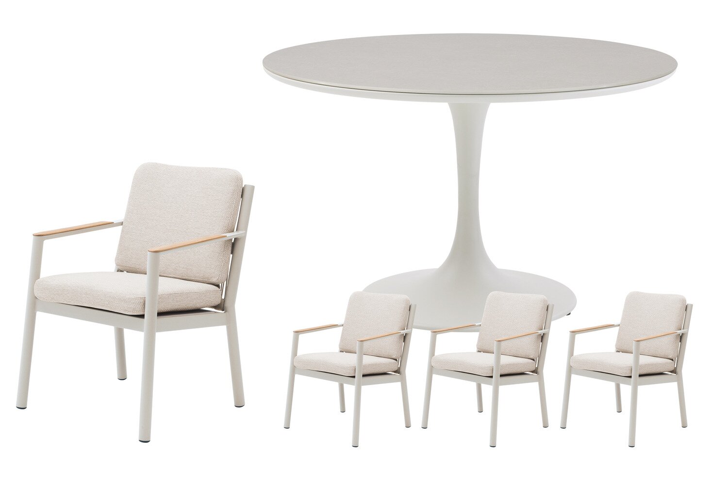 Binnen deze opstelling is de Jura dining tafel het centrale punt voor diners en gezellige buitenmomenten. Met een zandkleurig aluminium frame en een sintered stone tafelblad in grijs krijgt dit onderdeel een uitstraling die goed past bij intensief gebruik in tuin of op terras. Daarnaast heeft het meubel afmetingen van D 120 x H 74 cm.