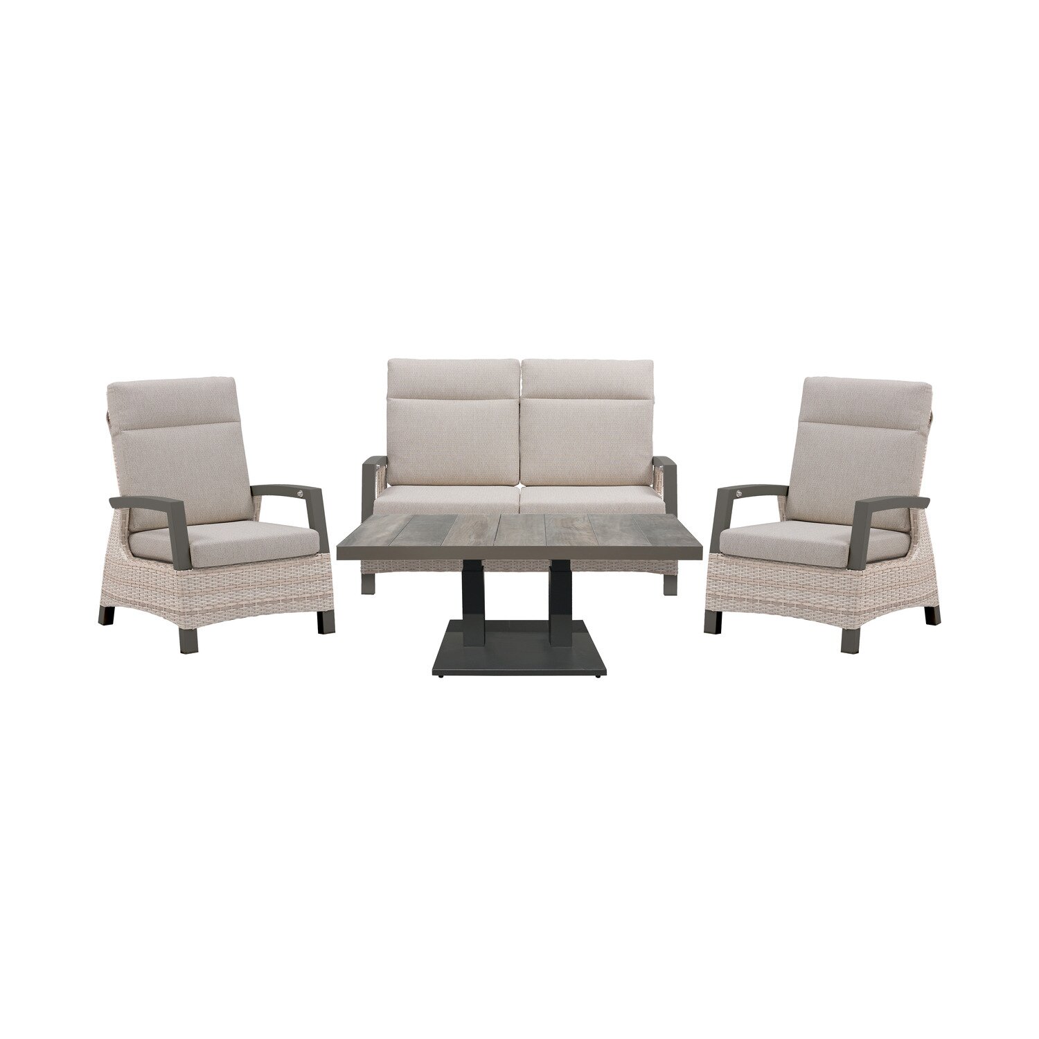 De Marbella dining tafel geeft deze set een praktische basis om samen buiten te eten en te ontspannen. De combinatie van een taupekleurig aluminium frame en een keramisch tafelblad in houtlook geeft het meubel een verzorgde uitstraling en zorgt voor een stevige basis voor buitengebruik. Ook praktisch is een in hoogte verstelbaar onderstel en afmetingen van L 140 x B 85 x H 49/72 cm.