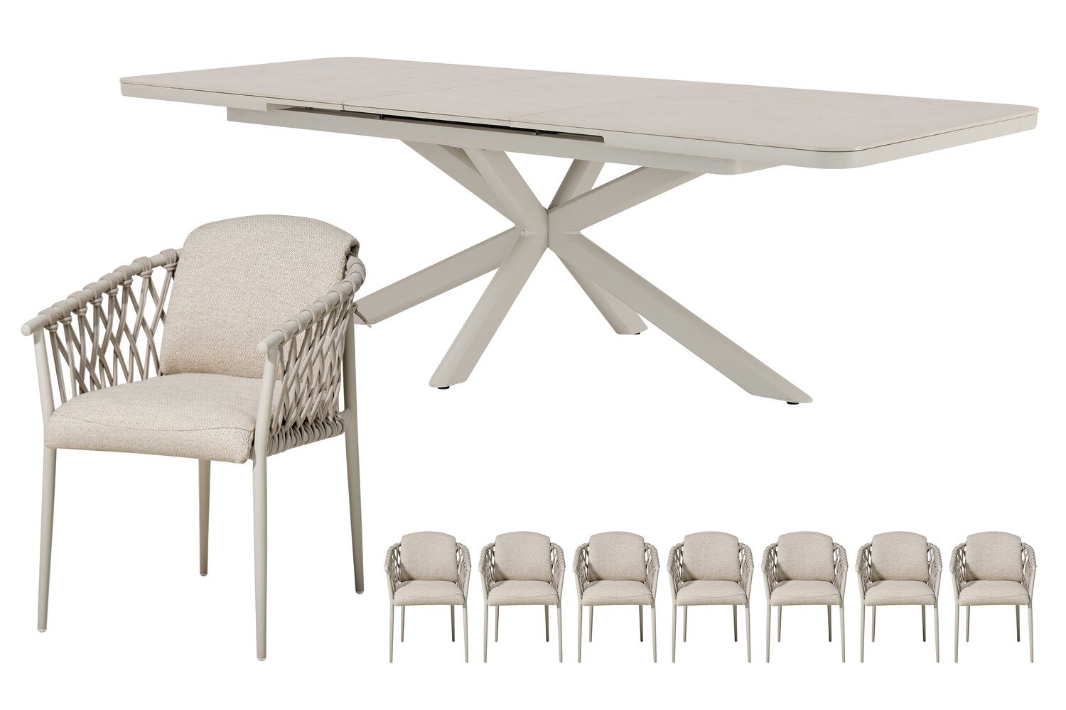 Miami dining set voor 8 personen van Royal Seasons® is een complete 8-persoons dining tuinset waarmee je van tuin of terras een comfortabele en verzorgde buitenplek maakt. De set bestaat uit 8 Miami dining stoelen en 1 Jura dining tafel. Dankzij de combinatie van aluminium, touw (rope) en oléfin krijgt het geheel een eigentijdse uitstraling en een stevige basis voor buitengebruik. Ideaal voor ontspannen momenten, lange zomeravonden en gezellig samenzijn in de buitenlucht.