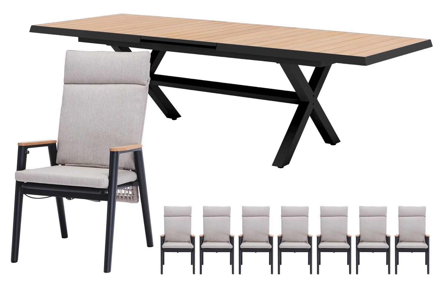 De Bahia dining tafel geeft deze set een praktische basis om samen buiten te eten en te ontspannen. Met een zwart aluminium frame en een teakhout tafelblad krijgt dit onderdeel een uitstraling die goed past bij intensief gebruik in tuin of op terras. Voor extra gebruiksgemak beschikt het meubel over een uitschuifbaar tafelblad en afmetingen van L 204/264 x B 100 x H 75 cm.