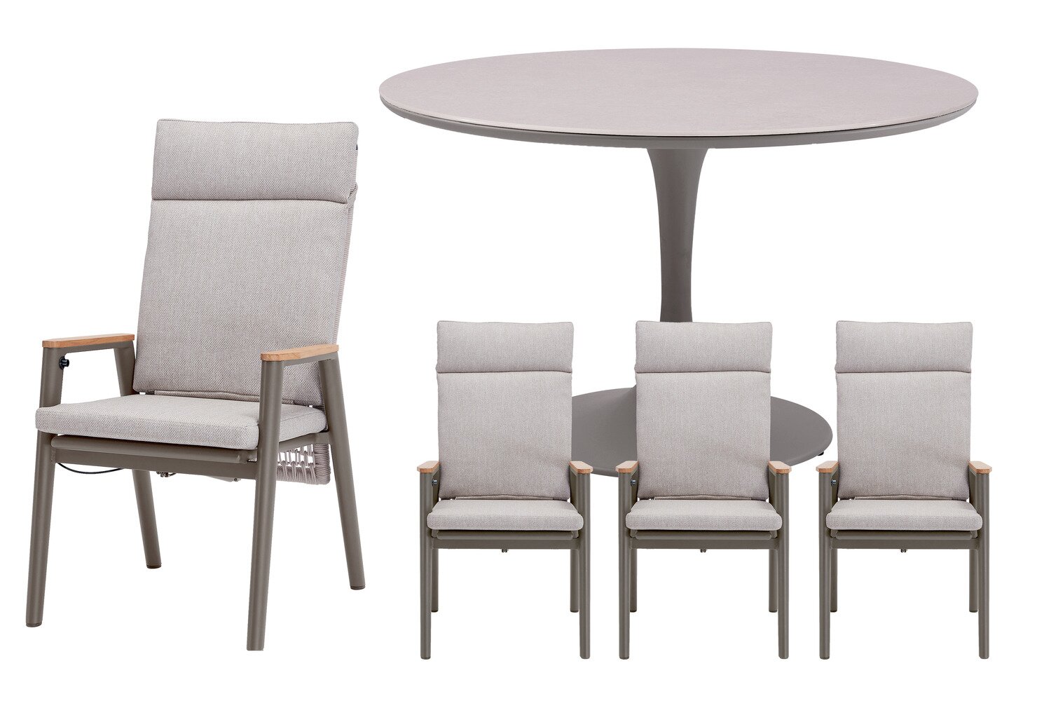 Portland ronde dining set voor 4 personen van Royal Seasons® combineert een moderne uitstraling met duurzame materialen, waardoor een onderhoudsvriendelijke en stijlvolle tuinset ontstaat.